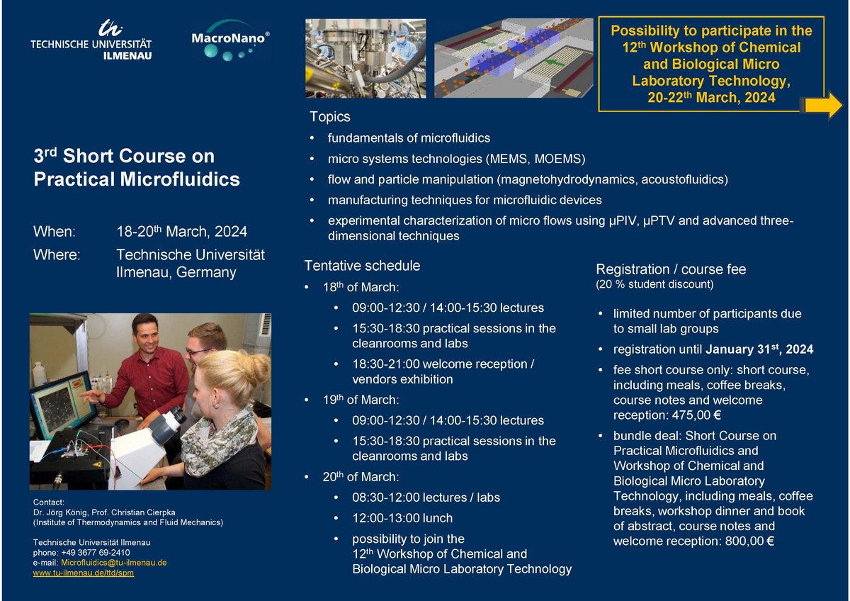 Im Programm enthalten sind verschiedene praktische Einheiten im Reinraum des Zentrums für Mikro- und Nanotechnologien sowie in weiteren Laboren. Die Veranstaltung ist eine einzigartige Gelegenheit für Doktoranden, Wissenschaftler und Industrieforscher, die ihre Kenntnisse in der Mikrofluidik vertiefen wollen.